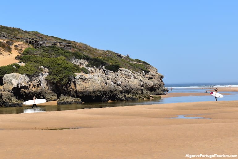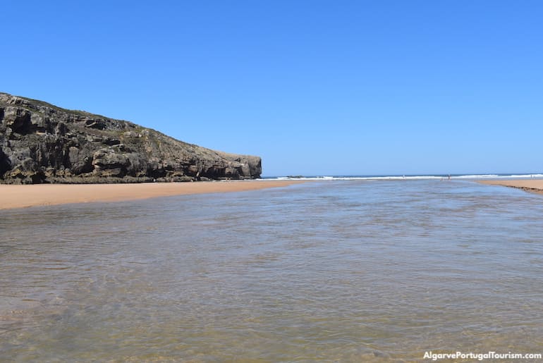 O extremo sul é a foz do rio, que percorre quase dez quilómetros desde a vila de Aljezur até aqui. Neste local, forma-se por vezes uma lagoa muito apreciada pelas crianças. Tanto as águas do rio como as do mar são limpas, como certifica a Bandeira Azul, mas as do rio são ligeiramente mais quentes e também mais seguras para nadar. No mar existem algumas rochas e correntes por vezes fortes, por isso redobre a sua atenção! Há vigilância de nadadores-salvadores no verão. As ondas atraem surfistas de todos os níveis. É possível alugar equipamento e ter aulas de surf através da escola na praia.